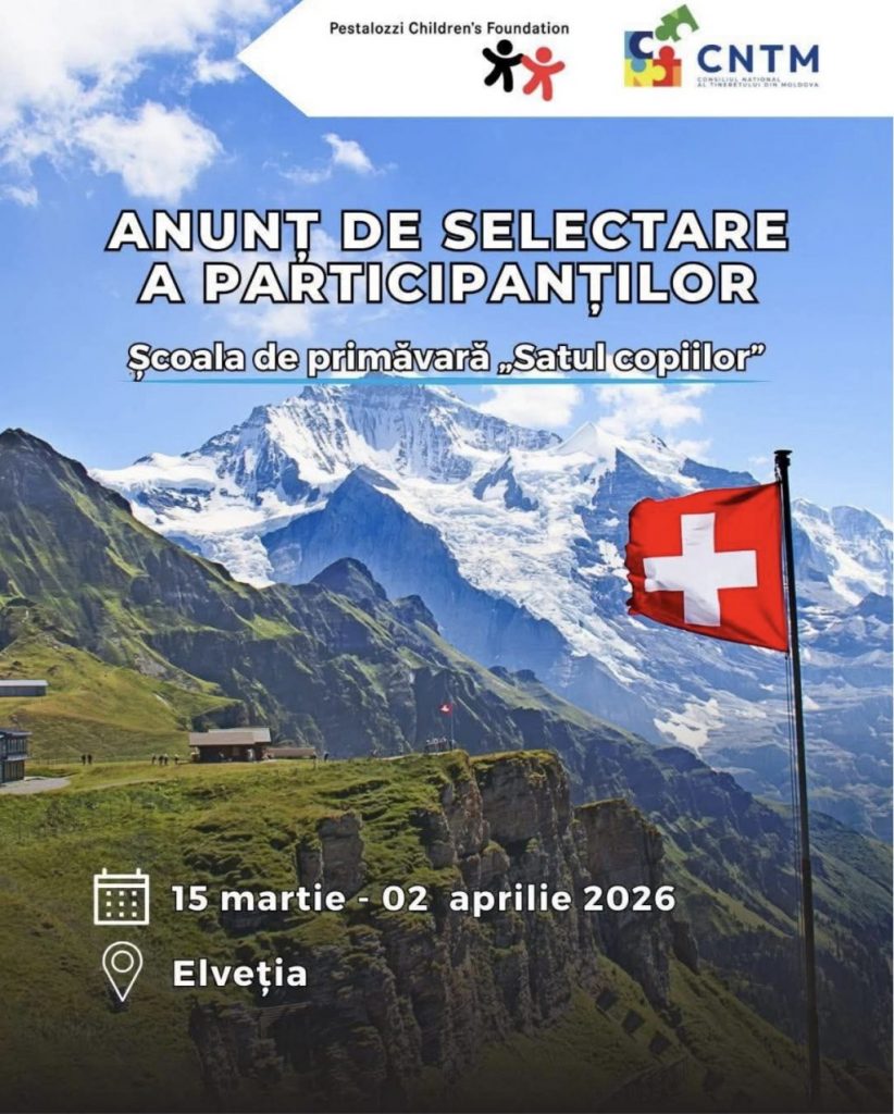 O oportunitate unică pentru tinerii moldoveni pasionați de experiențe internaționale. Consiliul Național al Tineretului din Moldova, în parteneriat cu Fundația pentru Copii „Pestalozzi”, organizează un schimb intercultural în Satul Copiilor Pestalozzi – Trogen, Elveția, între 15 martie și 2 aprilie 2026.